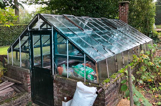 Le client possédait une ancienne serre des années 40 partiellement « sous terre ». En effet, autrefois, pour garder la chaleur, en plus d’un système de chauffage au bois, la serre était partiellement enterrée. Il fallait donc descendre 3 marches pour y pénétrer. Cette serre était fortement endommagée. Le client souhaitait la restaurer à l’identique.