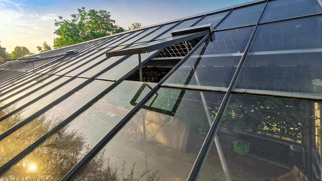 La longueur de la serre étant très importante, il a fallu calculer avec précision le dimensionnement des profilés métalliques. D’autre part, le terrain présentait un dénivelé important dont il a fallu tenir compte. Enfin, il a fallu construire la serre tout en conservant et protégeant les pieds de vignes en place. La serre a été posée sur un muret de briques. Elle présente une dizaine de lucarnes pour assurer une bonne ventilation. La serre a été divisée en deux parties : une partie chauffée et une partie non chauffée.