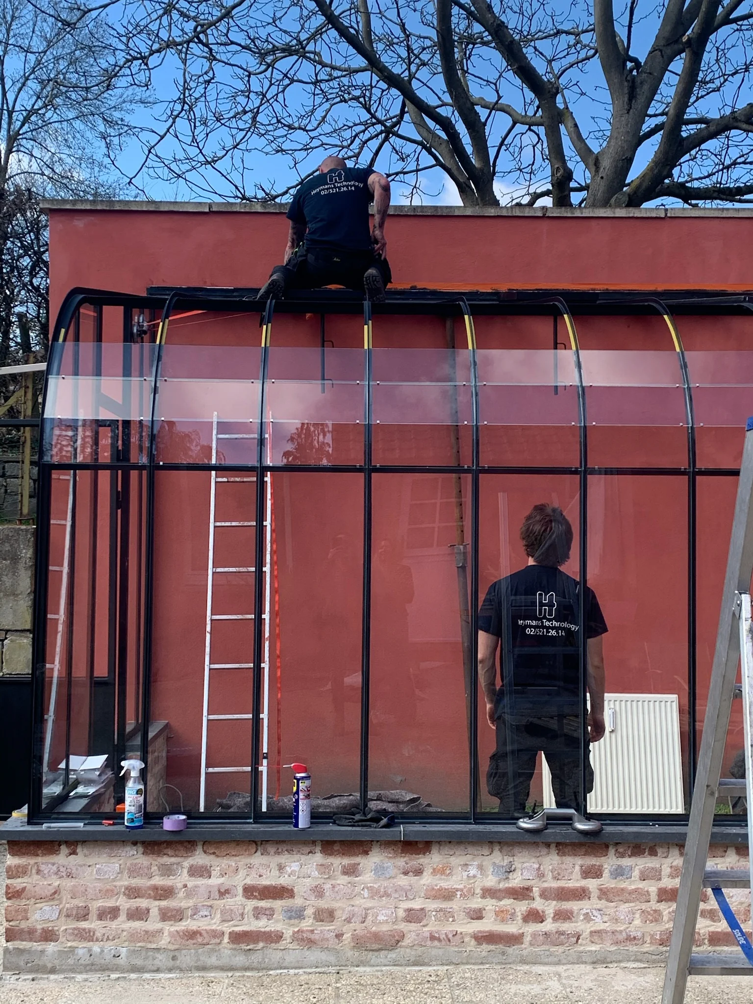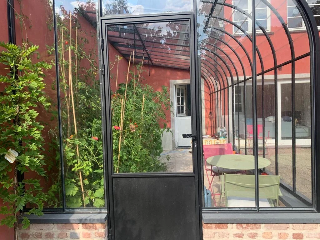 La cliente souhaitait une serre qui soit aussi une serre à vivre. Le challenge : il n’y avait pas d’accès depuis la rue. Aussi, a-t-il fallu faire passer les éléments de serre par-dessus la maison !
